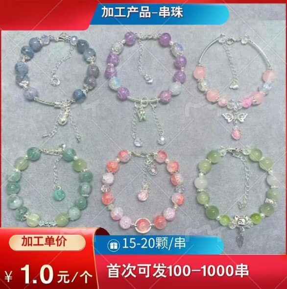 工人根据设计稿,将15-20颗珠子按配色方案依次穿入银质链条,搭配同色系隔片,确保每颗珠子间距均匀,手链整体弧度流畅。